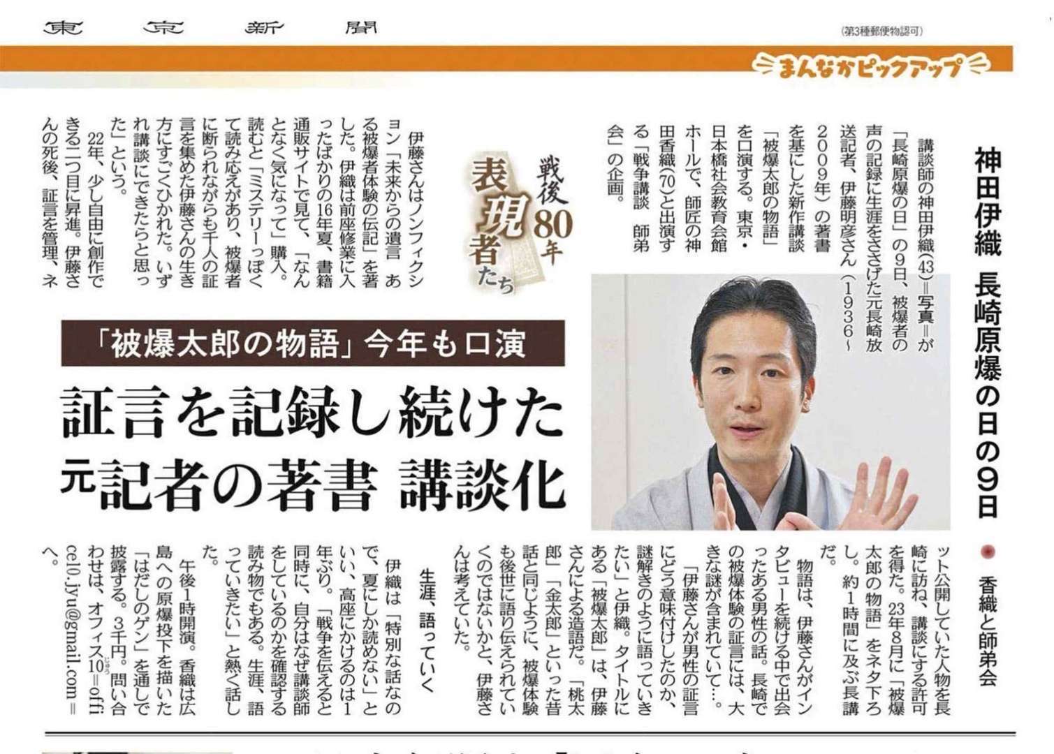 講師の神田伊織さん(43)=写真=が長崎原爆の日の9日、被爆者の証言を生き生きと語り継ぐ講談「被爆太郎の物語」をタスク長崎放送ホールで上演する。
